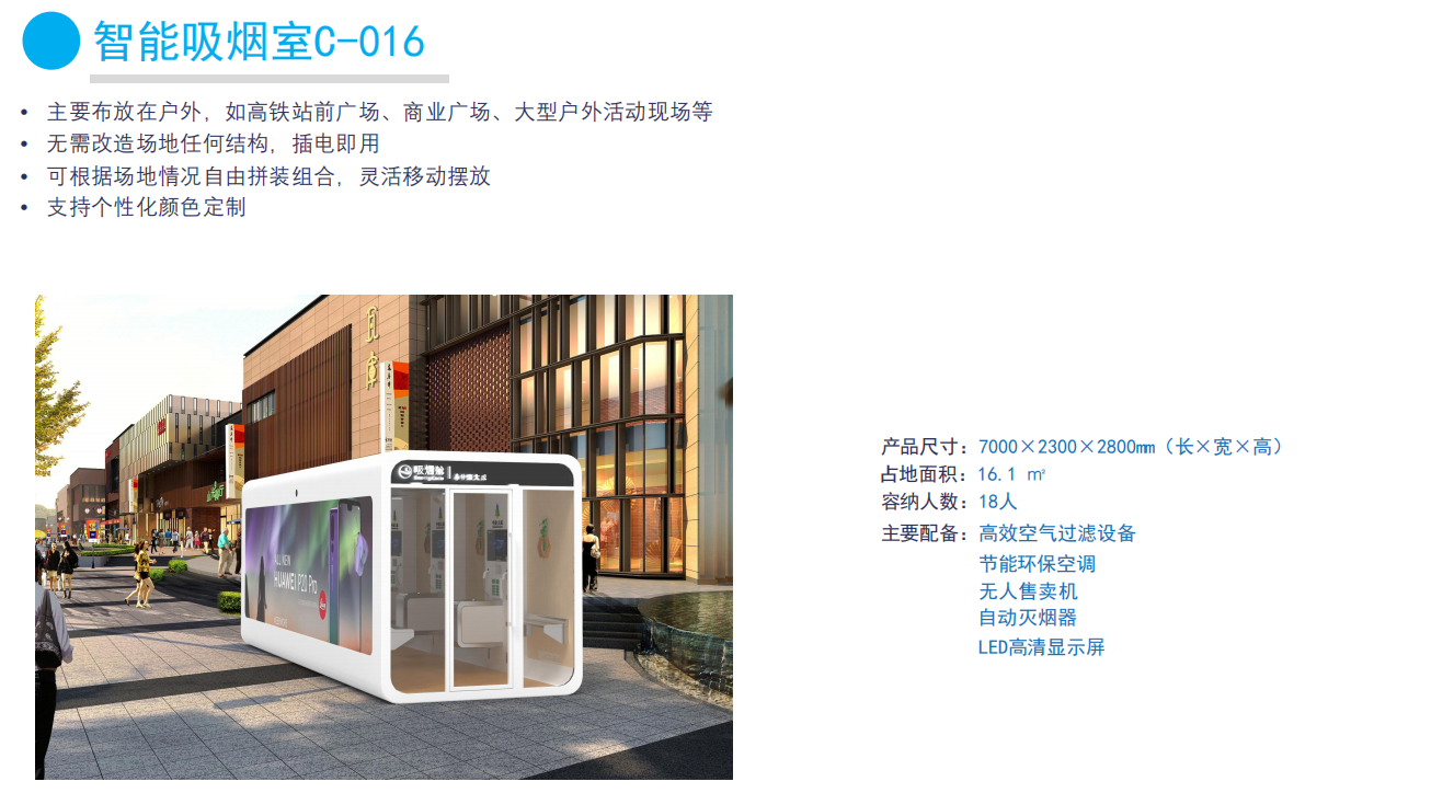 智能吸煙室C-016:主要布放在室內(nèi),如機場候機廳、高鐵站候車室、景區(qū)、商業(yè)綜合體、寫字樓、醫(yī)院等,無需改造場地任何結構,插電即用,可根據(jù)場地情況自由拼裝組合,靈活移動擺放支持個性化顏色定制。