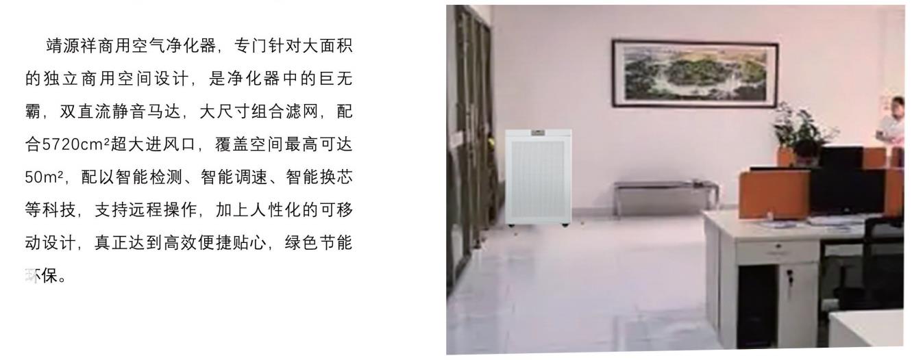 靖源祥商用空氣凈化器,專門(mén)針對(duì)大面積的獨(dú)立商用空間設(shè)計(jì),是凈化器中的巨無(wú)霸,雙直流靜音馬達(dá),大尺寸組合濾網(wǎng),配合5720c㎡超大進(jìn)風(fēng)口,覆蓋空間最高可達(dá)50㎡,配以智能檢測(cè)、智能調(diào)速、智能換芯等科技,支持遠(yuǎn)程操作,加上人性化的可移動(dòng)設(shè)計(jì),真正達(dá)到高效便捷貼心,綠色節(jié)能環(huán)保。