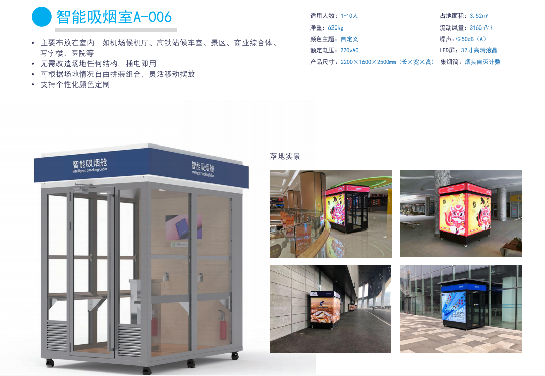 智能吸煙室A-006:主要布放在室內(nèi),如機(jī)場(chǎng)候機(jī)廳、高鐵站候車(chē)室、景區(qū)、商業(yè)綜合體、寫(xiě)字樓、醫(yī)院等,無(wú)需改造場(chǎng)地任何結(jié)構(gòu),插電即用,可根據(jù)場(chǎng)地情況自由拼裝組合,靈活移動(dòng)擺放支持個(gè)性化顏色定制。