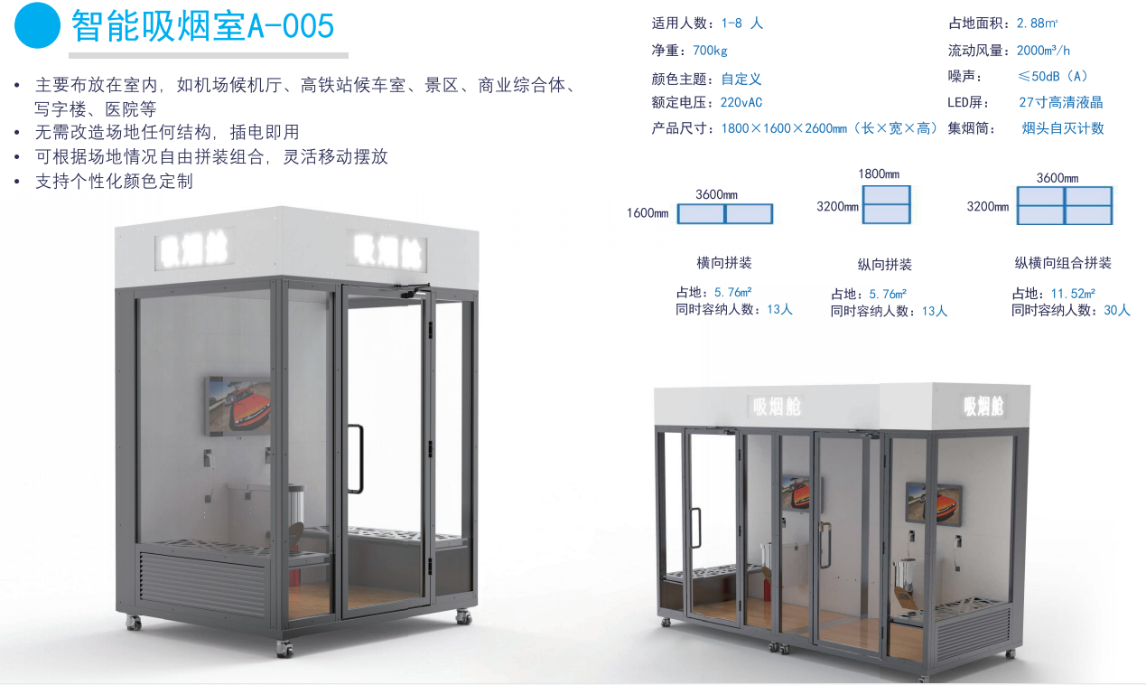智能吸煙室A-005:主要布放在室內(nèi),如機(jī)場(chǎng)候機(jī)廳、高鐵站候車室、景區(qū)、商業(yè)綜合體、寫字樓、醫(yī)院等,無需改造場(chǎng)地任何結(jié)構(gòu),插電即用,可根據(jù)場(chǎng)地情況自由拼裝組合,靈活移動(dòng)擺放支持個(gè)性化顏色定制。